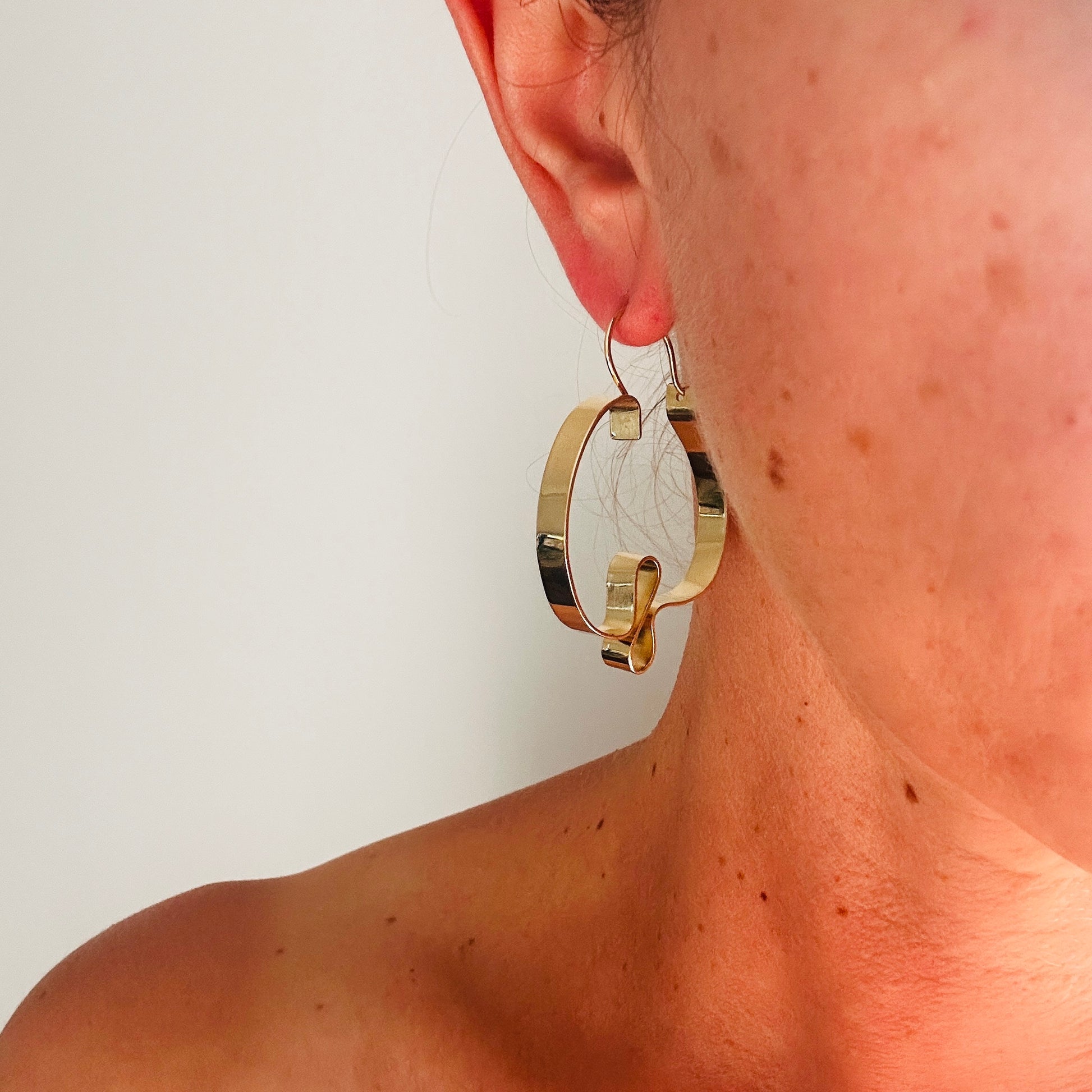 Description: The Beats Hoop Earrings reinterpret the classic hoop with a sculptural twist. Each earring is hand-formed from a single brass sheet and finished with 14k nickel-free gold plating. Measuring approximately 2 inches in height and 1.25 inches in width, their dimensional form is inspired by the rhythm of a figurative heartbeat. Despite their bold appearance, these earrings are lightweight and comfortable for all-day wear.