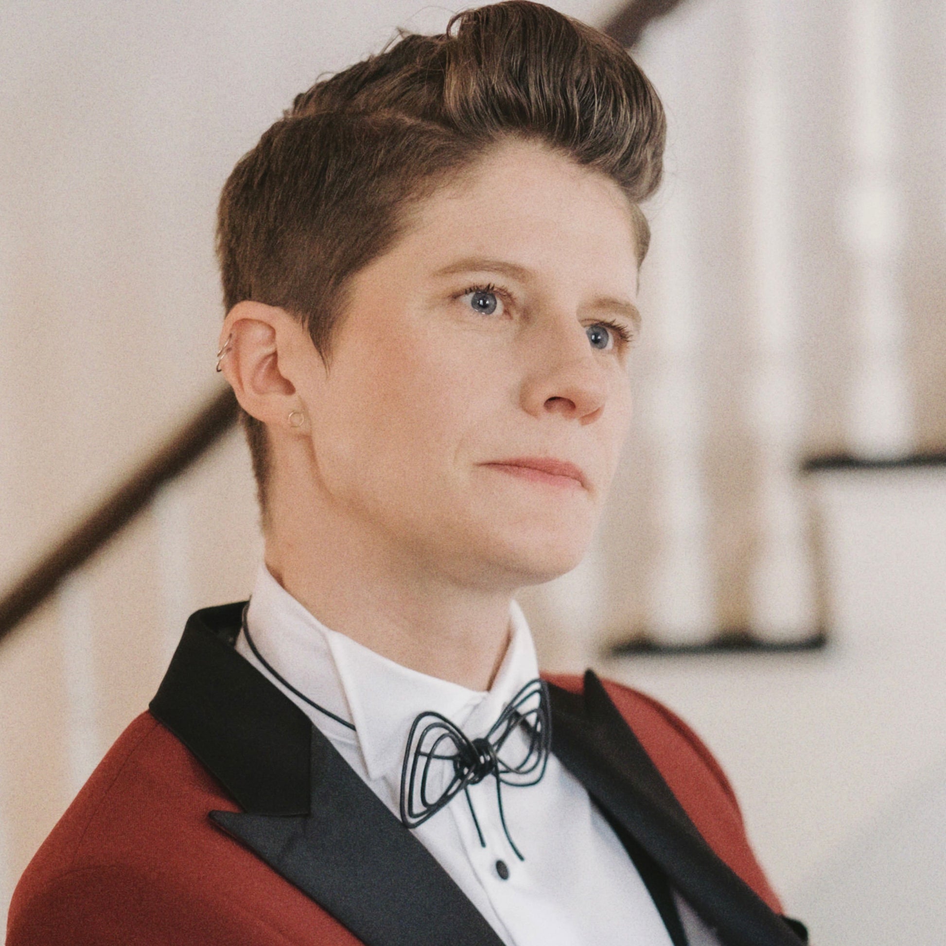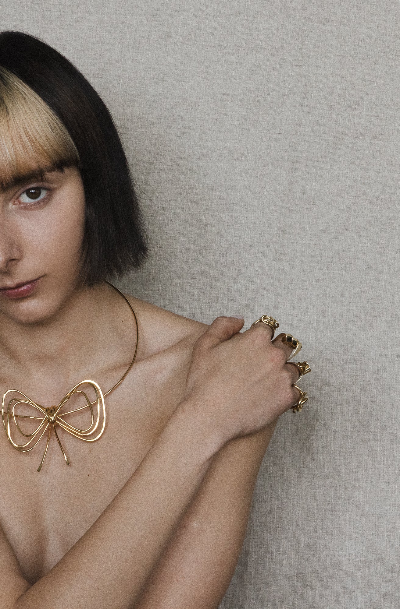 Originally created as a custom bowtie for a wedding, the Bow Necklace evolved into a signature piece within Oblik Atelier’s Drawing Series. Constructed from layered, thin brass wire, its open form balances structure with lightness. The bow itself measures approximately 3.5 inches wide and 2 inches tall, resting at the collarbone on a 2mm neck wire with a chain closure at the back. It’s finished in 14k nickel-free gold plate for a soft, luminous sheen.
