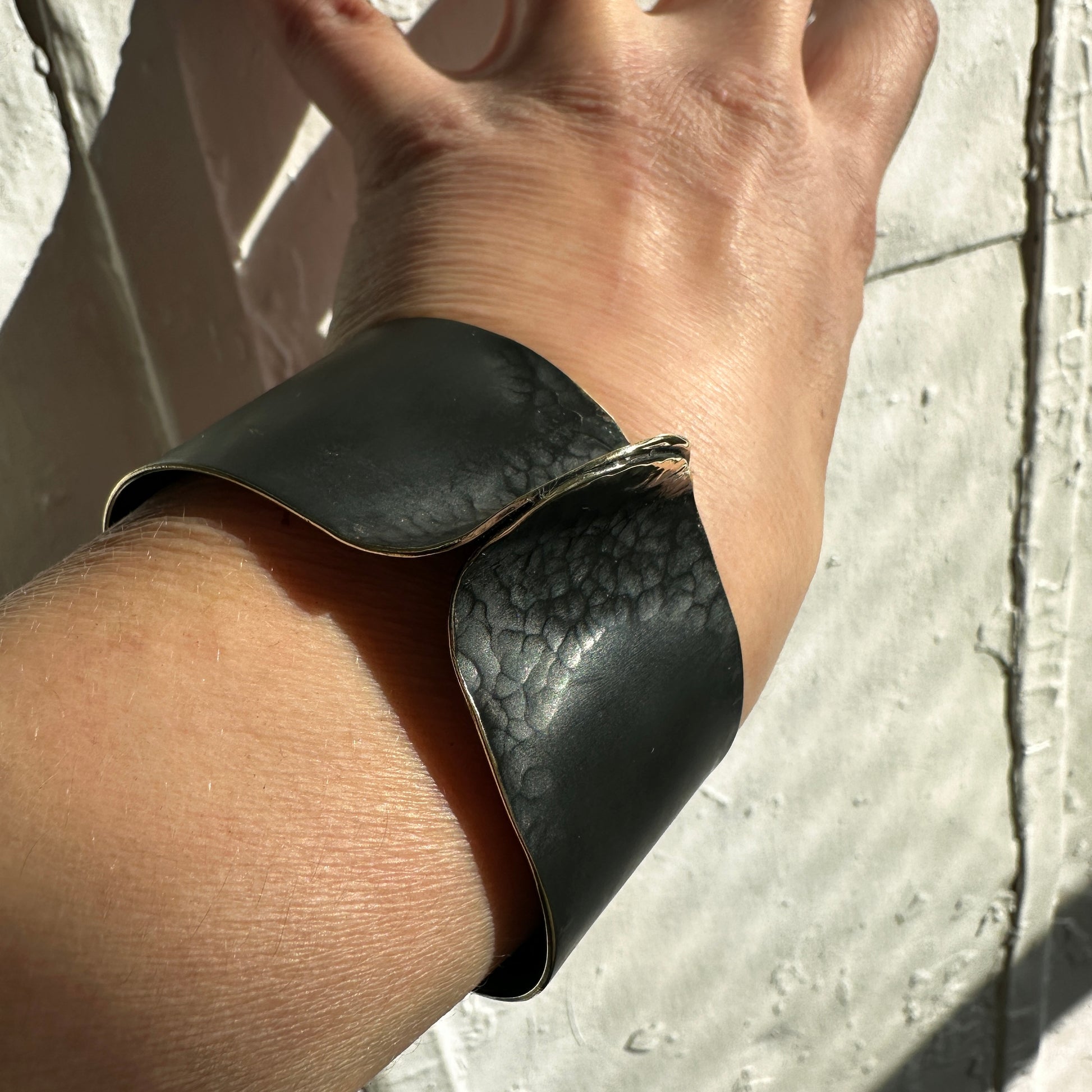 Description: The Two Come Together Cuff Bracelet is a distinctive piece designed for individuals seeking a bold accessory. Measuring approximately 1.5 inches in width, with the joined section rising about 0.75 inches above the wrist, this cuff is entirely handcrafted. Each bracelet is made in brass, cut, formed, and hammered by hand, then finished with a patina, ensuring that every piece is unique.