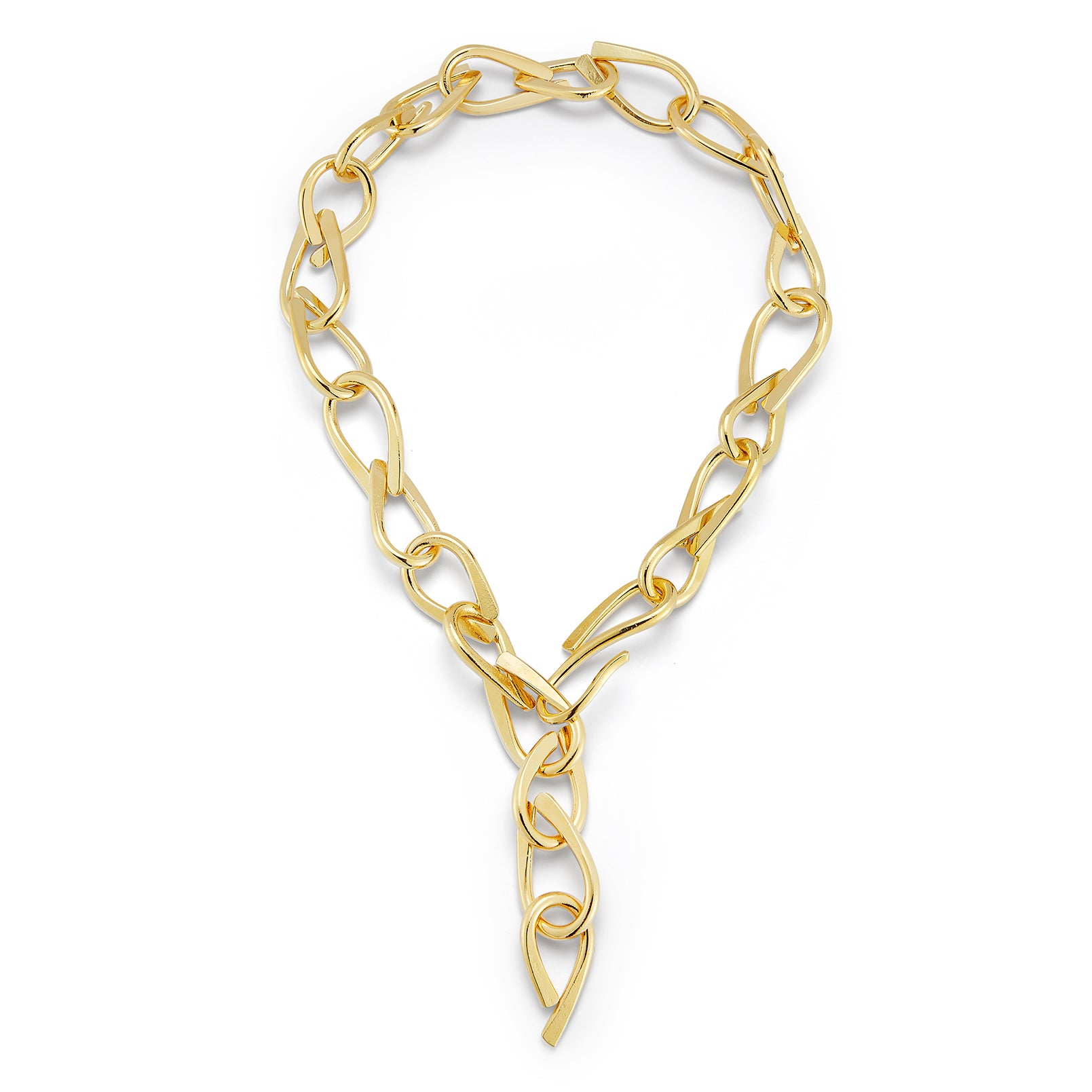 Description: The Connected Chain Necklace is a testament to meticulous craftsmanship and timeless style. Each of its approximately 1-inch links is individually handcrafted from brass, culminating in a chain measuring around 20 to 21 inches in length. This length allows for versatile styling options: wear it as a traditional necklace, a lariat, or a Y-necklace. The piece is completed with an integrated S-hook closure and finished with 14k nickel-free gold plating for a refined appearance.