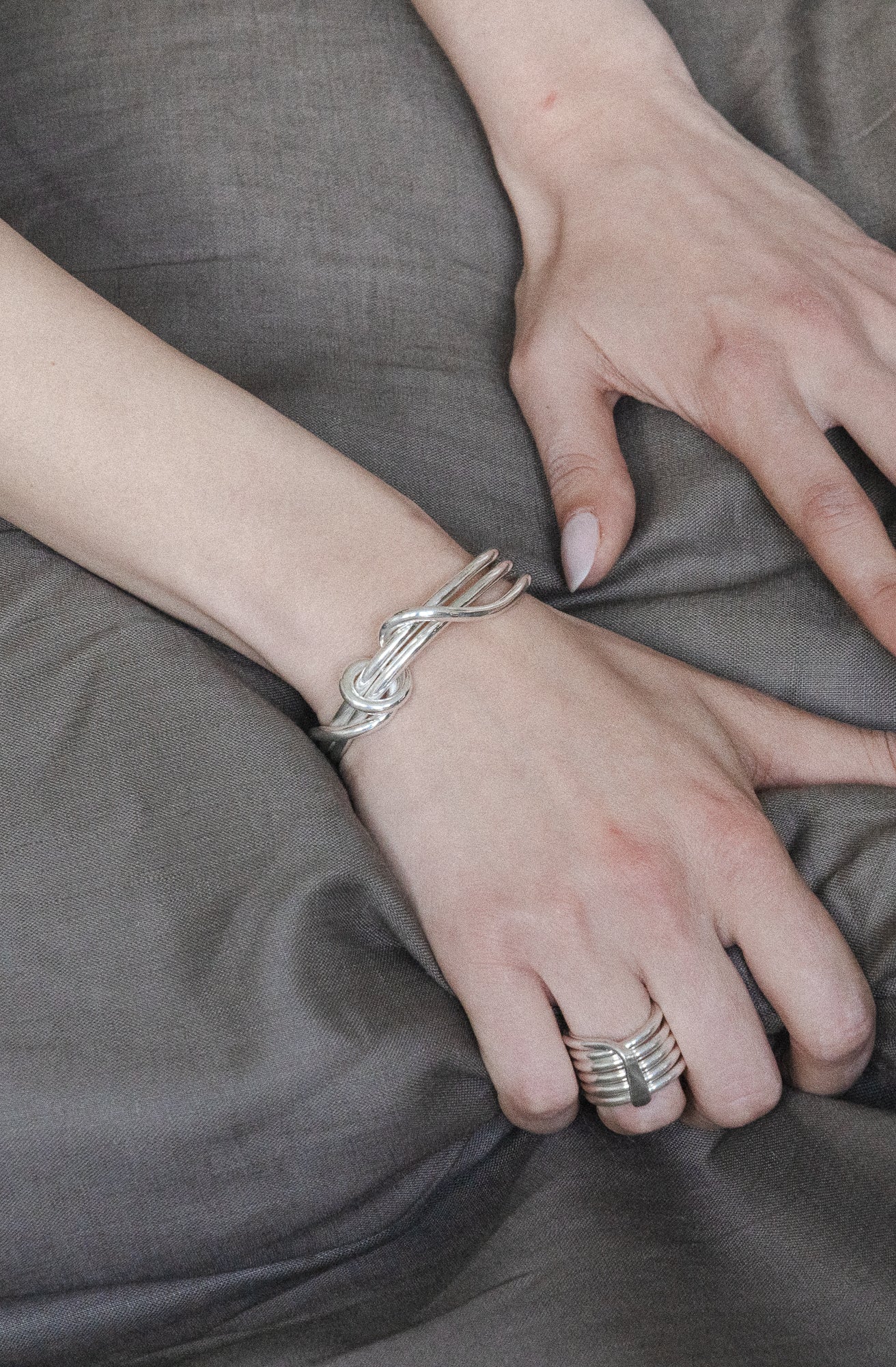 Description: The Cross Over Ring is meticulously handcrafted from tightly coiled 3mm sterling silver wire, culminating in a distinctive folded-over detail at the top. Measuring approximately 0.75 inches in width, this ring offers a comfortable fit with a substantial feel. Its high-polish finish enhances the sleek, modern aesthetic.