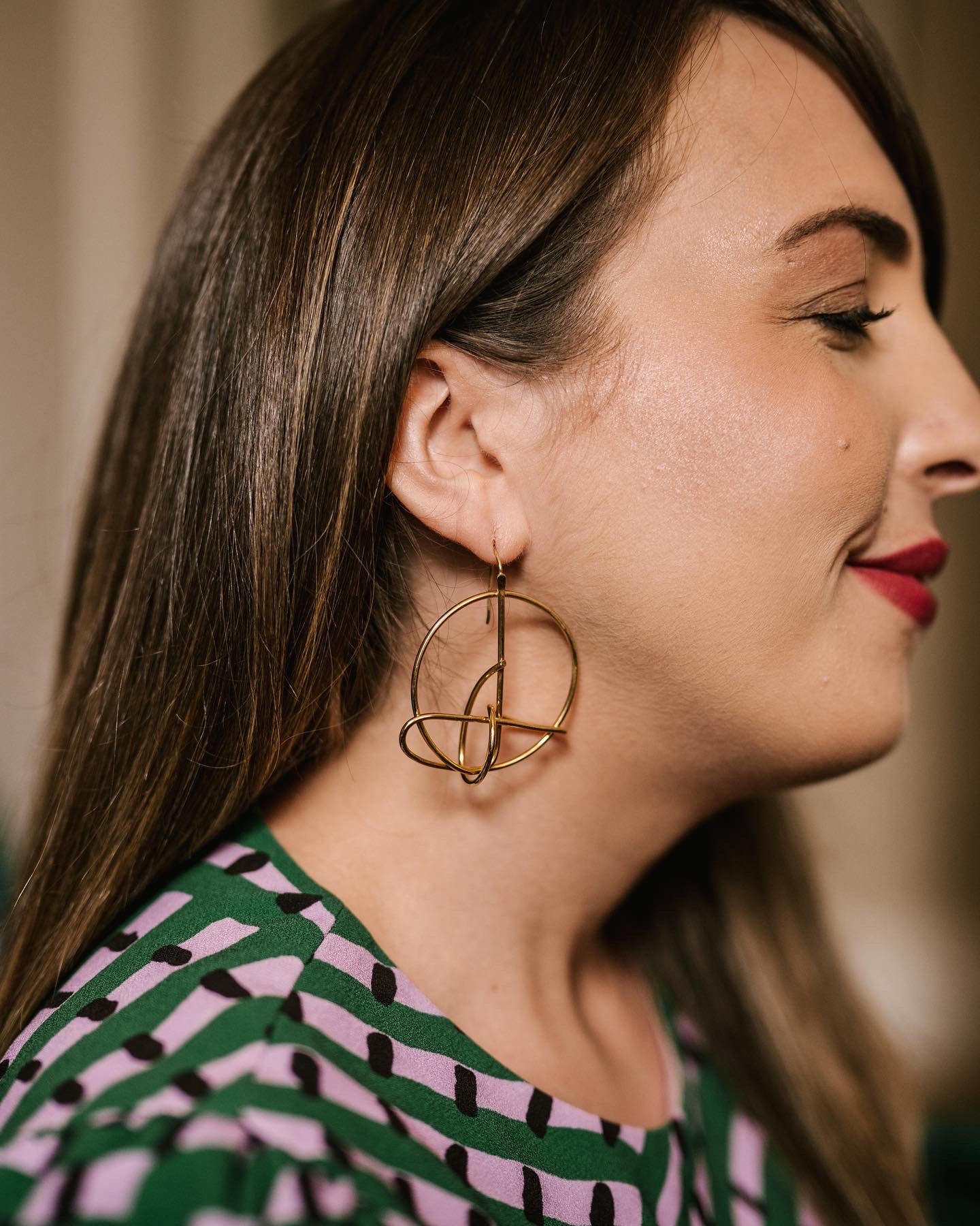 Description: The Drawing No.4 Earrings are frontal post earrings designed to frame the face with a bold yet lightweight presence. Each earring is hand-fabricated from a single 1mm brass wire, coiled onto itself to create a sculptural form. Measuring approximately 2 inches in diameter, they are finished with 14k nickel-free gold plating. Despite their dramatic appearance, these earrings are easy and light to wear, making them suitable for various occasions.
