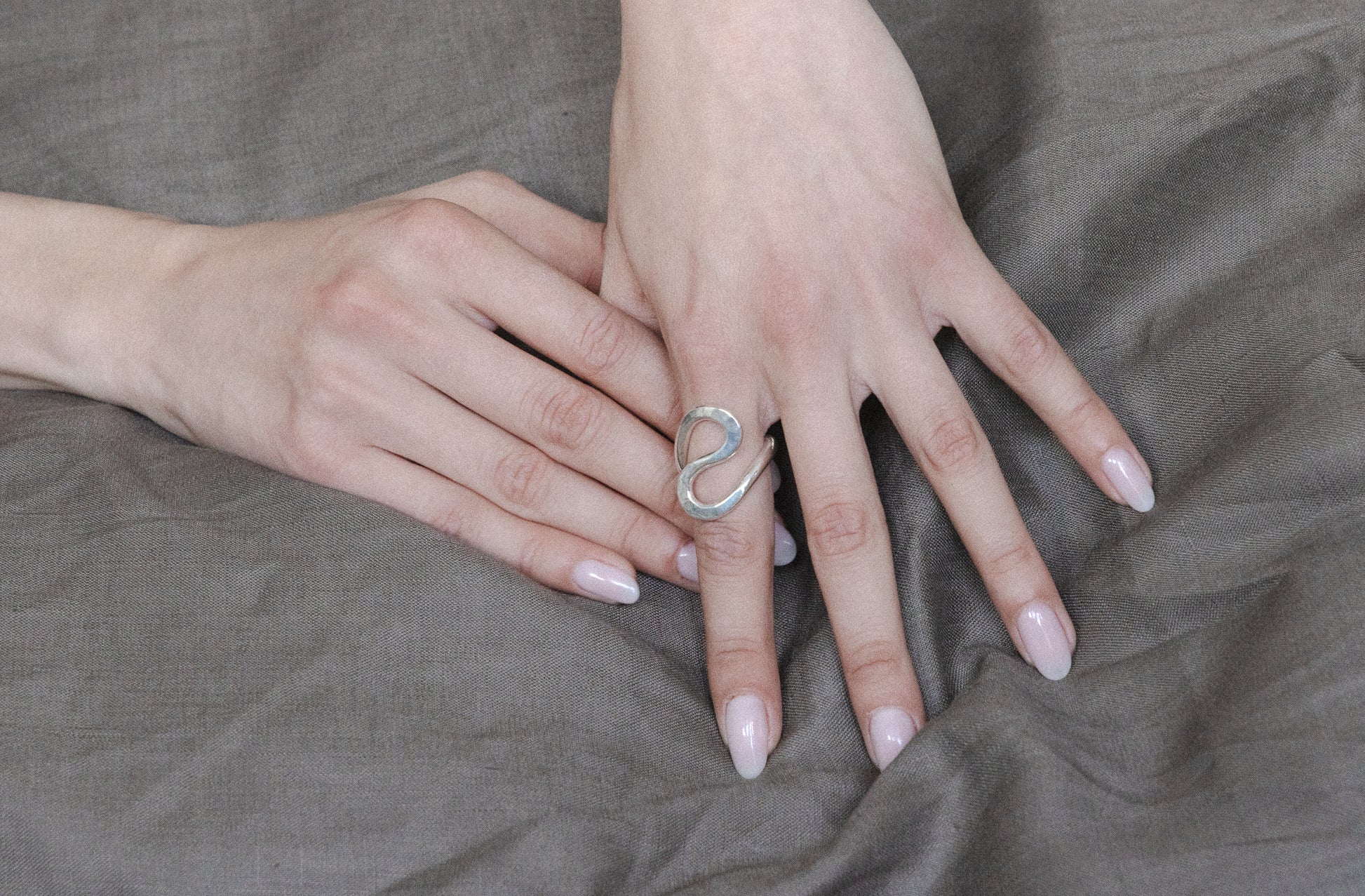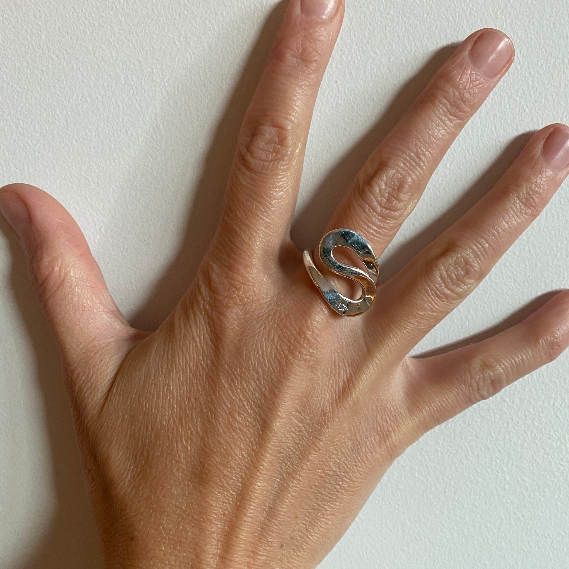 Description: The Infinity Ring is meticulously handcrafted from 3mm sterling silver wire, shaped to create a bold and modern design. The top features hammered details, with flared pieces that nestle on the knuckles and hug the finger. The top area measures approximately 1 inch by 0.5 inches. The ring is finished in a high polish, enhancing its sleek appearance.