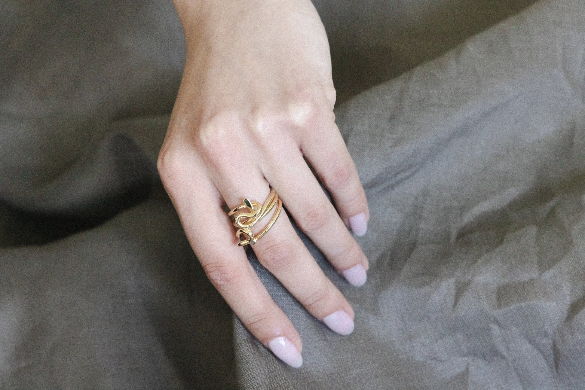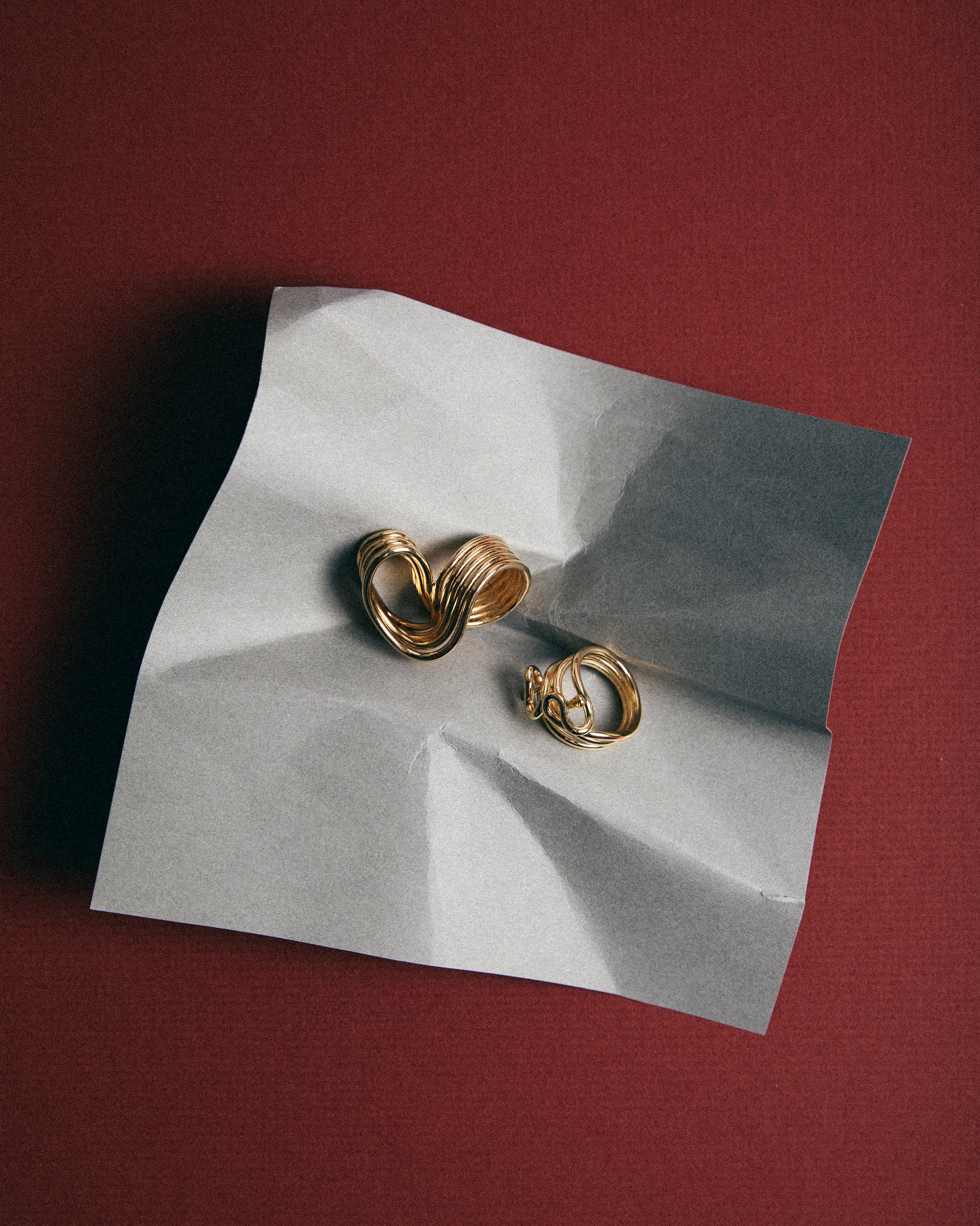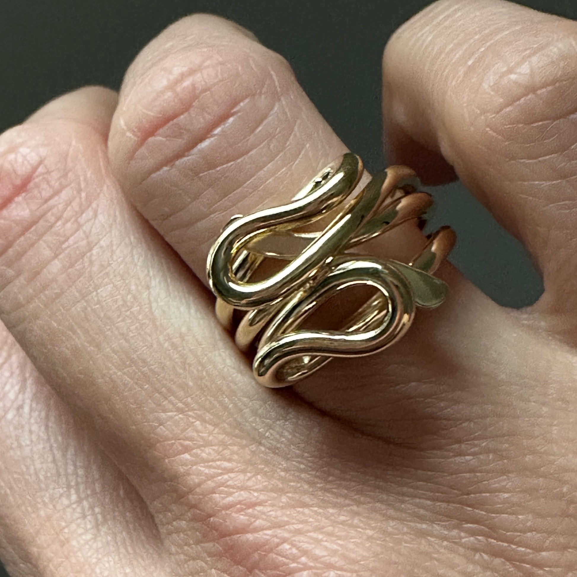 The Isma Ring was originally created as a custom piece for a client named Ismael in the summer of 2023. His only guidance? A love for Oblik Atelier’s Serpens Earrings and the Bandaid Ring—two very different forms. The challenge was to merge them into a single design. The result is a bold, layered ring composed of three individually fabricated bands, joined together to form a piece that’s both sculptural and fluid.