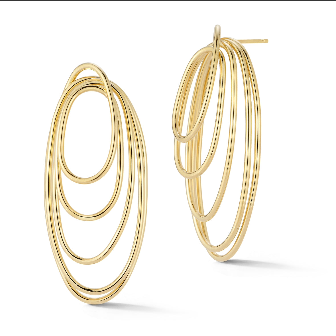 The Melodrama Earrings are bold statement pieces, each handcrafted from a single brass wire looped onto itself to create a three-dimensional form. Despite their substantial size—approximately 2.5 inches in length and 1 inch in width—they remain lightweight and comfortable for extended wear. Finished with a 14k nickel-free gold plating, these earrings offer a striking addition to any jewelry collection.