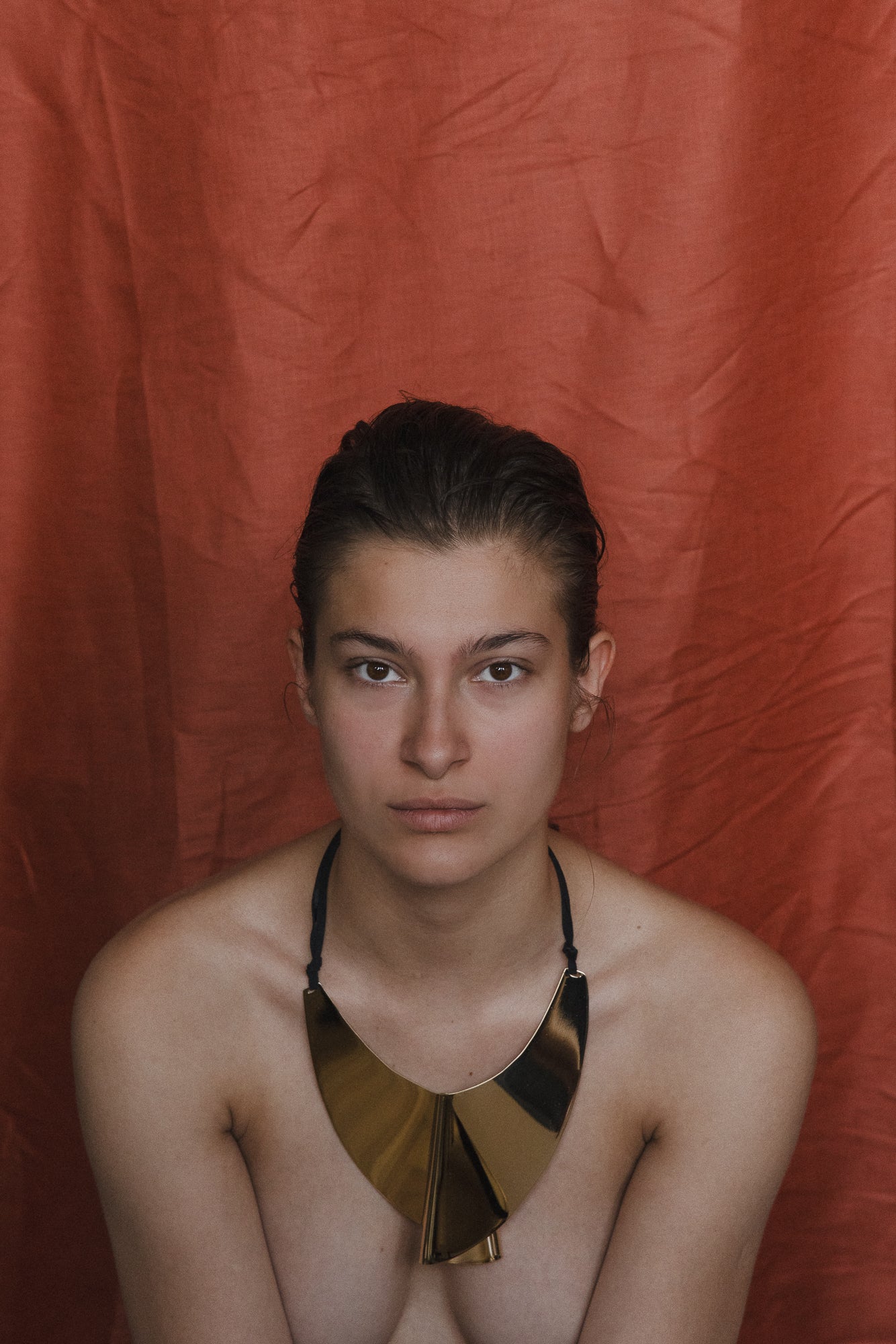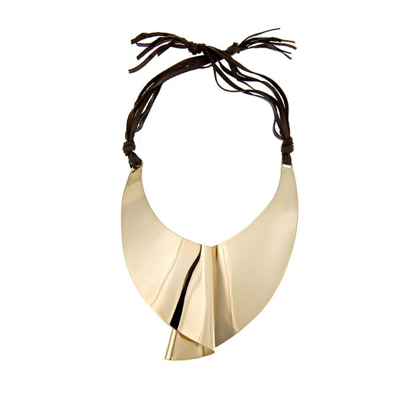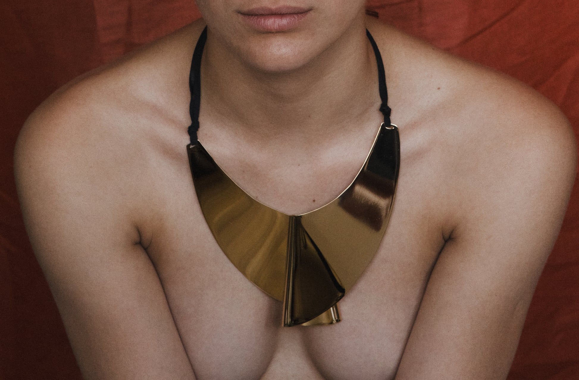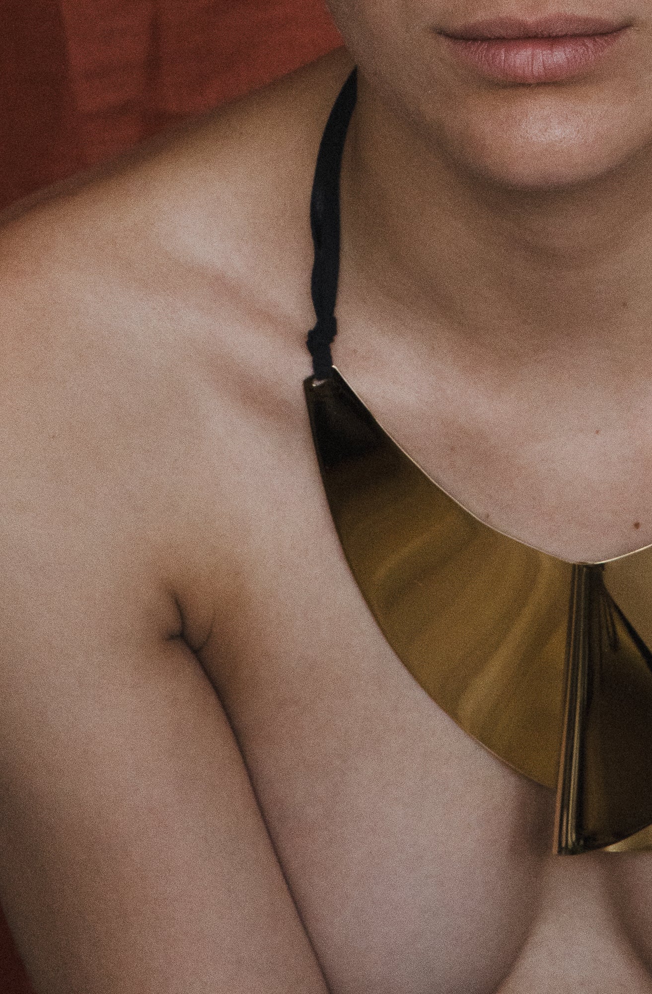 Description: The Mr. Finn (Moby Dick) © Necklace is the signature piece from Oblik Atelier's Brass Band Collection. This shield-like necklace is incredibly light, measuring 6 inches by 5 inches, and ties in the back, allowing for versatile styling depending on your outfit. Finished with soft leather straps that contrast beautifully with the oversized metal surface, this piece is hand-formed in brass with 14k nickel-free gold plating.