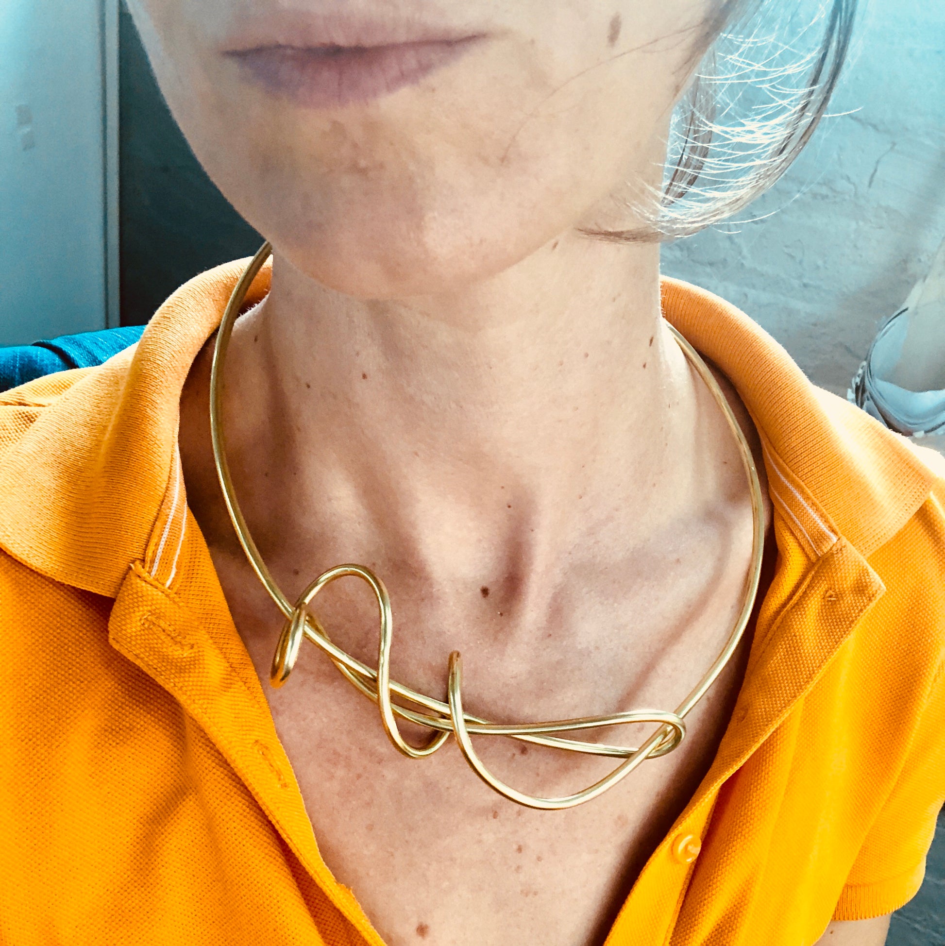Description: The Needle and Thread Collar Necklace is a visually stunning piece, created by forming and sculpting a single 3mm round brass wire into a miniature wearable sculpture. Each necklace is handcrafted, resulting in a unique shape as the wire responds differently during the forming process. Measuring approximately 6 inches by 7 inches in width and about 1 inch in overall height, this necklace sits gracefully on the collarbones, complementing the neck area. It features a 14k gold-plated finish and is designed to look elegant on bare skin, a turtleneck, or a crew neck.