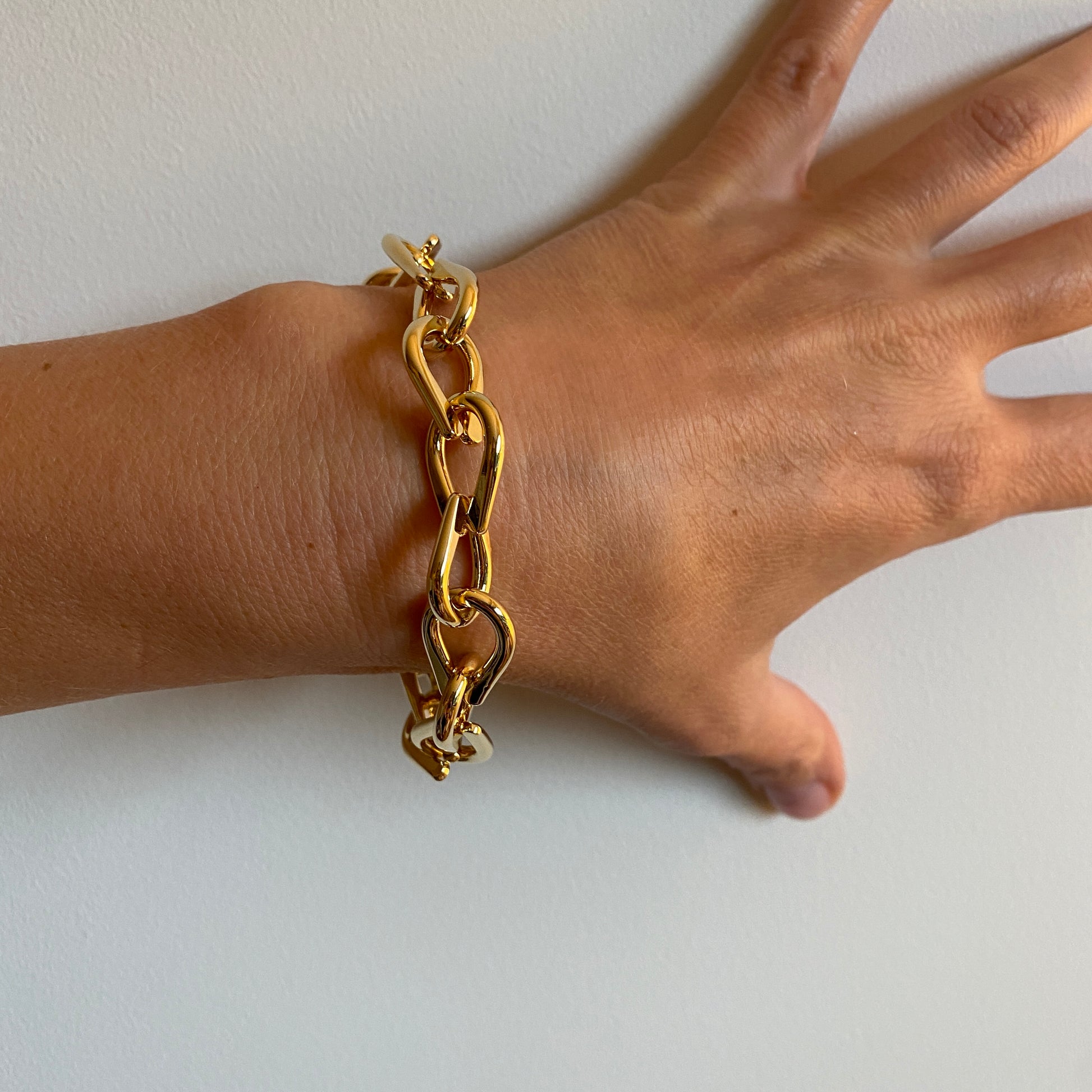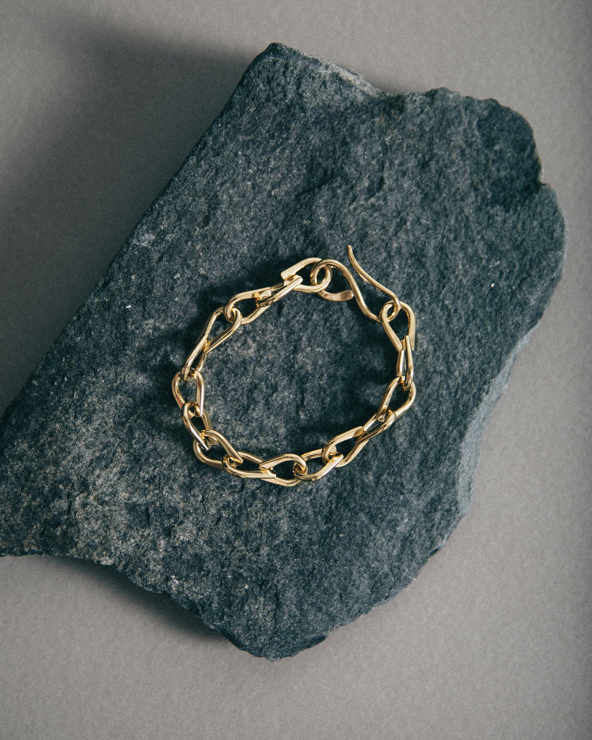 Description: Inspired by the positive reception of the Connected Chain Necklace, the Reconnected Bracelet offers a refined take on chain jewelry. Each link is individually handcrafted from 2mm brass wire, meticulously hammered, bent, and assembled to create a cohesive piece. The bracelet features Oblik Atelier's signature S-hook closure and is finished with a 14k nickel-free gold plating, ensuring both elegance and durability. To provide a tailored fit, customers are encouraged to specify their wrist size upon ordering.