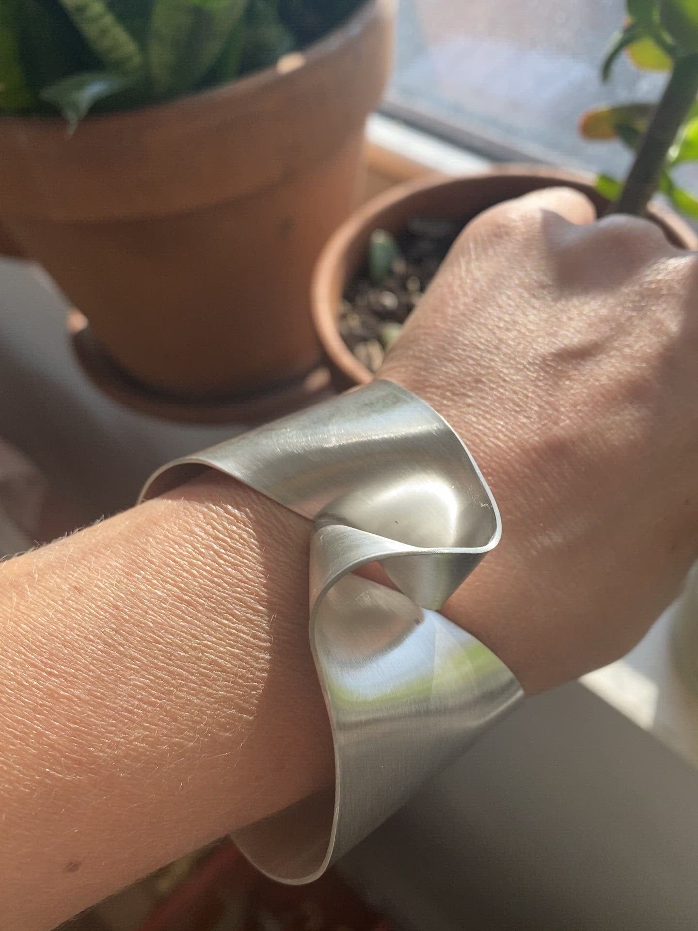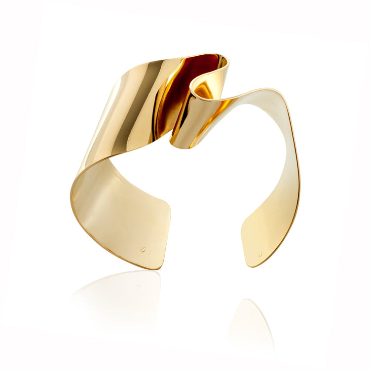 Description: The Rivers Cuff Bracelet is a sinuous sculpture, something quite unusual, yet very much wearable. It is hand-pierced from a single sheet with a lovely twist at the top. Approximately 1.5 inches wide at the cuff, with the top twist around 1.5 inches high. Hand-formed in brass and finished in 14k nickel-free gold plating. Also available in sterling silver.
