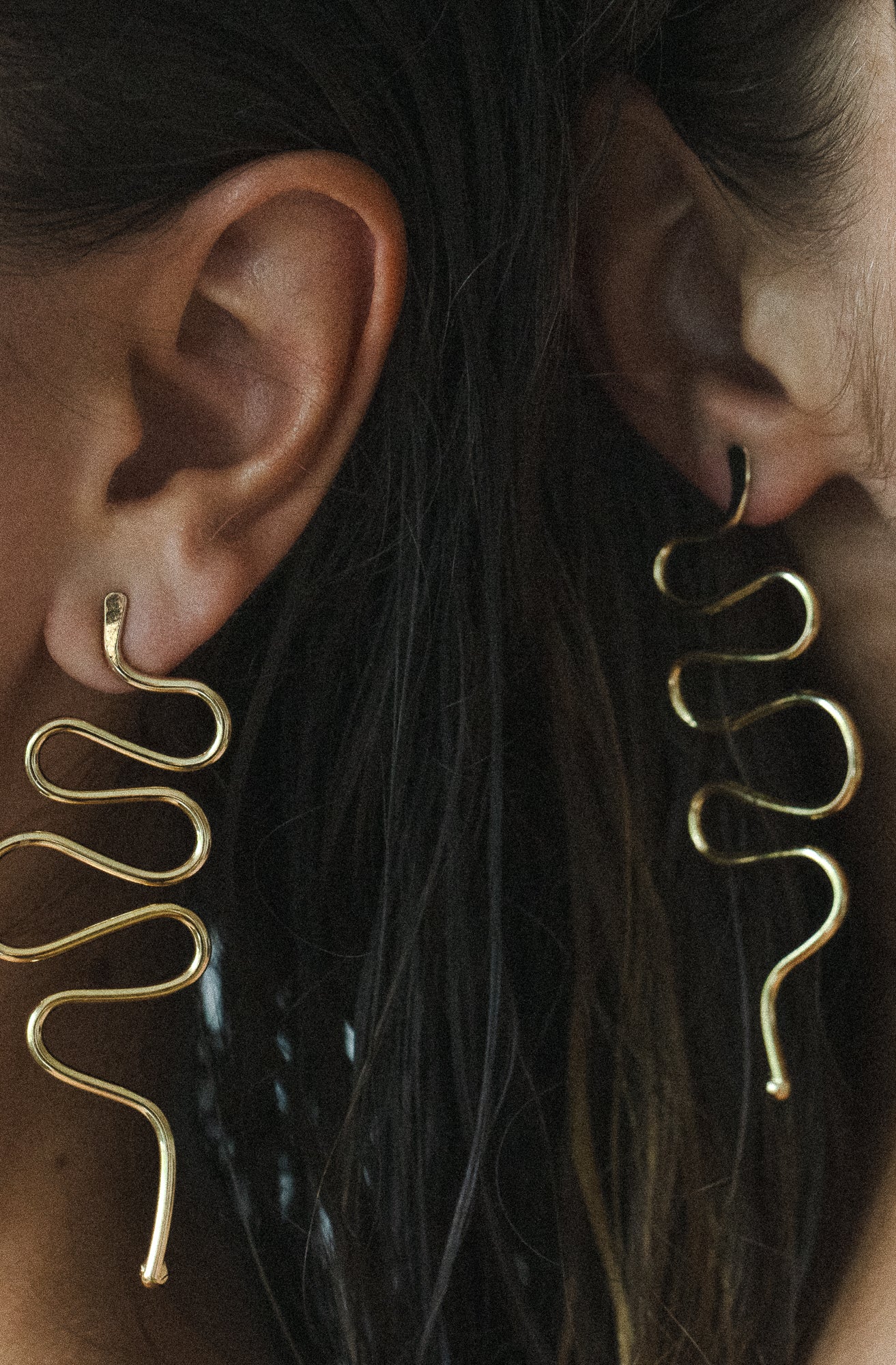 Description: The Serpens Earrings feature a graceful, serpent-like form, offering a blend of simplicity and sophistication. Handcrafted from brass and finished with nickel-free 14k gold plating, these earrings measure approximately 3 inches in length and 1 inch in width. Due to their handcrafted nature, slight variations in shape may occur, adding to their unique charm.