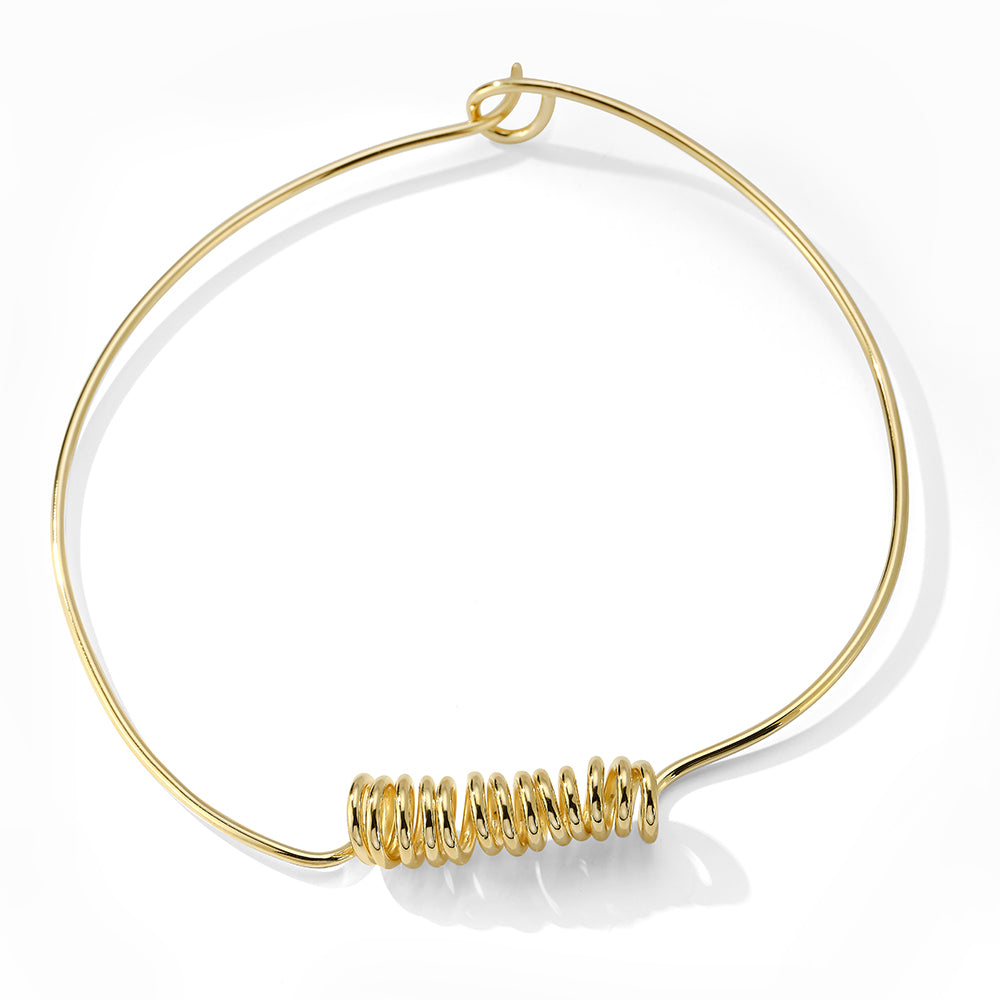 Description: The Spring Forward Necklace embodies simplicity and elegance, featuring thirteen meticulously hand-coiled loops that gracefully rest along the collarbone. Crafted from 2mm brass wire and finished with 14k nickel-free gold plating, this piece serves as both a subtle statement and a conversation starter. Its lightweight design ensures comfort for daily wear.