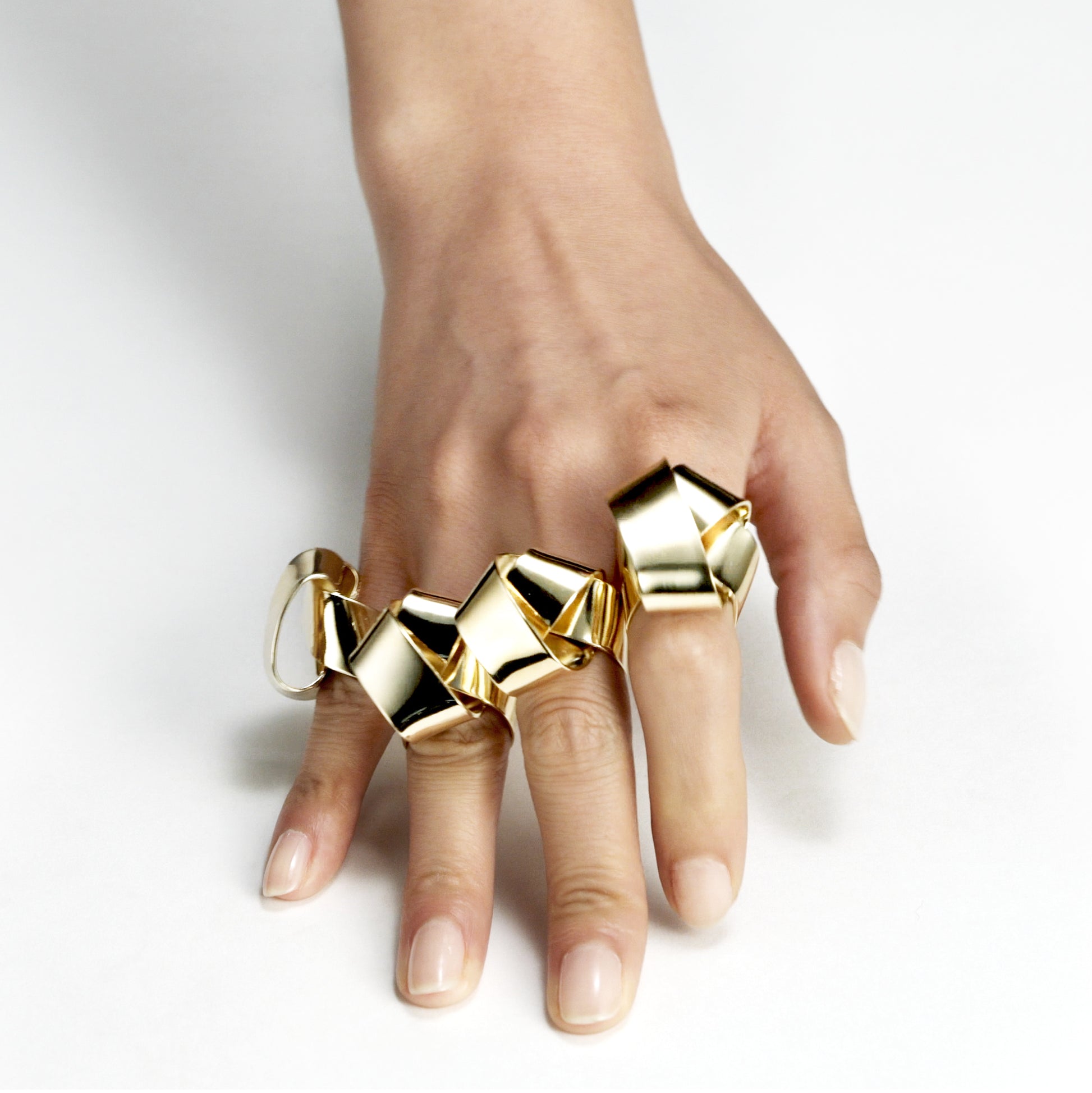 Description: The Wrapped Ring by Oblik Atelier is a sculptural piece that wraps around the finger like a ribbon of metal. Hand-fabricated from brass and finished with 14k nickel-free gold plating, the ring measures approximately 0.5 inches in width and stands about 0.75 inches above the finger. Its unique design offers a comfortable fit and a distinctive look, making it a conversation starter. Also available in sterling silver.